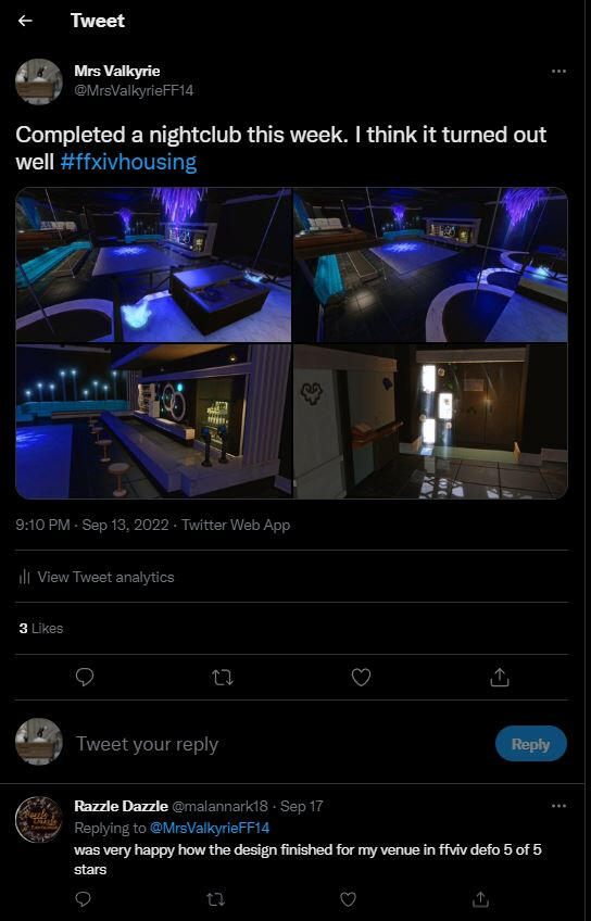Large-FCThis one is a little different. This was a massive project to make this FC house look like a replica of the LUX nightclub from the show Lucifer. To show comparison, FFXIV is on the left and an actual picture from the show will be on the right. This club is no longer standing and has since been demolished. If you see a LUX in the game, it was not done by me.The custom stairs to the main basement as well as the DJ booth were custom built with a large number of partitions.